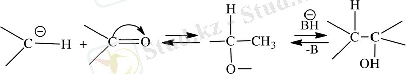 Карбонилді топтағы альдегидтер мен кетондардың молекулалары реакцияға жоғарғы сатыда жүреді. Көміртегіге қарағанда оттектегінің электртерістілігі жоғары болғандықтан оттегі атомының электронды тығыздығы көміртегі атомына қарағанда төмен, яғни карбонилдің қос байланысы поляризацияланғанда дипол момент 2. 7- дей болады. Карбонилдегі көміртек электрофильді қасиетке ие болғандықтан ол электрофильді реагентерге әсер етеді. Карбонилді топ молекулалары электронды тығыздықтың ығысуын тудырады. Осыған байланысты карбонилдің әсері кабонил тобындағы атомдарымен еріксіз әсерлескенінен (α - жағдайды) . Көмірсутек тізбегінің бұзылуына әкеп соқтырады. Содан циклды кетонның реакцияласуын жоғарлатады. Кетондардың конденсациясында байланыстың болуы белсенді метил тобының болуы Квенагеля реакция деп атайды [15] . Бұл реакициялар белгілі Перкин реакциясының модификациясы болып табылады және де осыған ұқсас механизімдерге ие. Осыған негізделе метил тобындағы протондары үгітіледі, ал түзілген карбонион альдегидтің карбонил тобымен төмендегі схема бойынша әрекеттеседі: