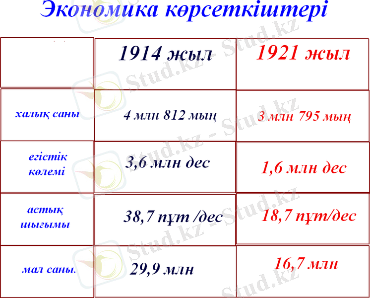 1920 жылдың аяғында Қазакстанда 4, 7 миллион адам тұрды. Оның ішінде қазақтары -50, 3, орыстары - 31, 1, украиндары - 14, 4 пайыз. Халықтың басым көпшілігі ауыл шаруашылығында еңбек етті. Ал, ауыл шаруашылығы мешеу жете дамымаған еді. Егіншілікте жерді біраз тыңайтып алып қайта жырту жүйесі, мал шарушылығында көшпелі және жартылай көшпелі шараушылық басым болатын. Егістің көлемі азамат соғысы жылдарында едәуір кеміп астықтың жалпы көлемі мен түсімі үш есеге жуық азайды. Егер егістік көлемі 1914 ж. 3, 6 млн. десятина болса, 1922 ж. 1, 6 млн. десятинаға қысқарды. Мал шаруашылығы да ауыр халге ұшырады. 1914 жылдан 1922 жылдың аяғына дейін ірі қара мал саны 2, 1 млн-ға, жылқы-2 млн-ға, қой-ешкі 6, 5 млн-дай, түйе-0, 3 млн-ға азайды. Жалпы алғанда осы жылдары барлык, мал тұрі 10, 8 млн. басқа кеміді.
