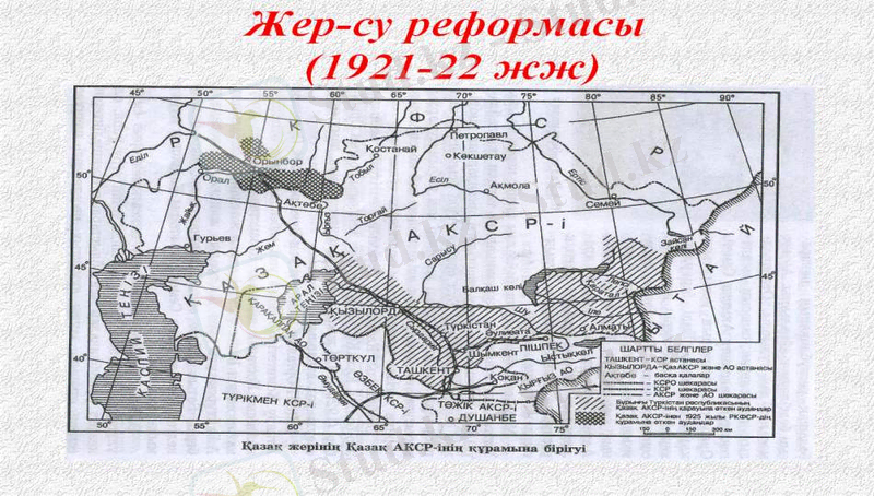 1921 жылы ақпан айында жер-су реформасы Түркістанның көптеген аудандарында, оның ішінде Алматы, Қапал, Шымкент, Әулиеата уездерінде жүргізілді. Жайық өзенінің сол жағалауының бөлігі межелеп бөлінді. Қазақ шаруалары жайылымдарын алды.