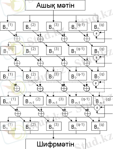 3 - ші суретте GDES алгоритмінің блок схемасы көрсетілген. Алгоритм GDES өзгермелі ұзындықты ашық текстік блоктармен жұмыс атқарады. Блоктік шифр q 32 биттік блок астарына бөлінеді, нақты саны блоктың оның көлеміне байланысты болады. Жалпы жағдайда q 32 - ге бөлінген блок көлеміне тең.