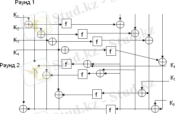 F функциясы әрбір раундқа бір реттен есептелген. Нәтижесінде ХОR операциясының көмегімен қалған барлық бөліктерін қосады және оларды циклді оңға орналастырады. GDES алгоритмі n раундының ауыспалы сандарын қолданады. Соңғы раундта өзгерістер енгізілген, яғни шифрлеу және шифрді алу процесстері бір - бірінен кілт астарын реттік қолдануымен ерекшеленеді. Суреттелген алгоритм DES - ке айналады, мұндағы q = 2 және n = 16.