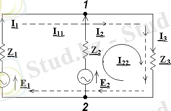 Контурлы токтар тәсілімен схемаға байланысты құрылған теңдеулер жүйесін келтіреміз. I 11 (Z 1 +Z 3 ) + I 22 Z 3 =E 1