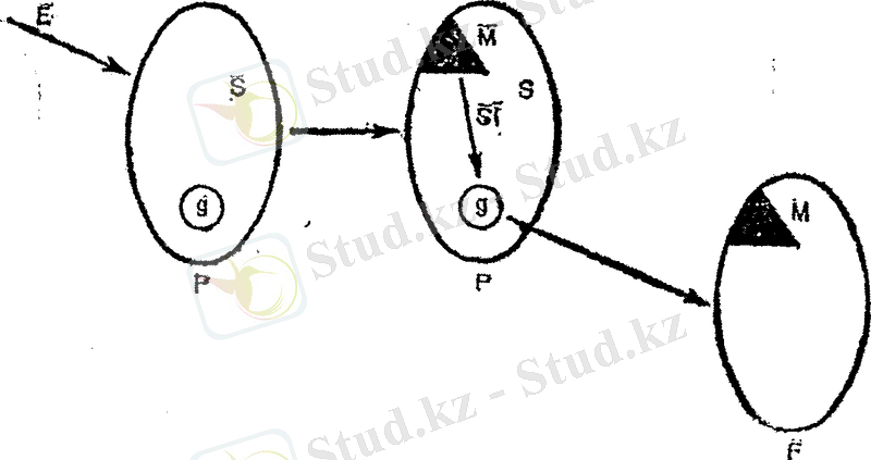 1-сурет. Е- қоршаған ортаның 5 ағзаның сомасына әсері; Р және М - пайда болатын модификациялық өзгерістер; 81 -келесі Ғ ұрпаққа берілетін (р) ағзаның жыныстық жасушаларда (§) өзгеріс тудыратын соматикалық индукция.