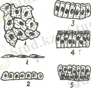 а - бір қабатты жалпақ; б - куб төрізді, а - цилиндр тәрізді, г - көп қатарлы кірпікшелі эпите-лий. 1 - базальдық мембрана, 2 - дәнекер ұлпа, 3 - кірпікшелі клеткалар, 4- бокал тәрізді клет-калар, 5 - аралық клеткалар.