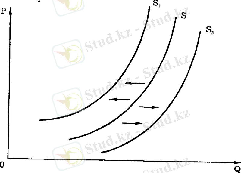 Әрине, бұл жерде де баға факторы ең маңызды болып табылады және бағаның өзгеруінен ұсыныс қисығының бойында өзгеріс орын алып, нәтижесінде ол ұсыныс көлемін өзгертеді (сурет 15 a) . Ал бағадан тыс факторлардың өзгеруі салдарынан ұсыныстың өзі өзгереді де, нәтижесінде ұсыныс қисығы толығымен оңға және солға жылжиды. Мысалы, өндіріс факторларына деген бағаның өсуінен ұсыныс қысқарады және қисық S жағдайынан S 1 жағдайына солға ығысады, және керісінше, өндіріс факторларының бағасы төмендегенде ұсыныс артады да қисық S жағдайынан S 2 жағдайына оңға жылжиды (сурет 1ә) .