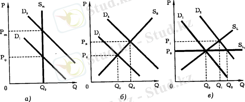 Сурет 2. Өте қысқа мерзімде (а), қысқа мерзімде (б) және ұзақ мерзімде (в) баға мен ұсыныс көлемінің өзгеруі