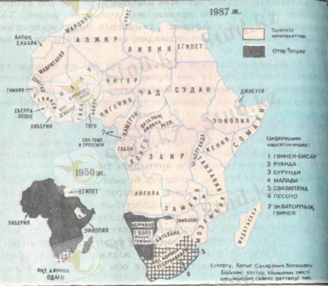 Отаршылдық системаның ыдырауы. Материкте құлдыққа салушыларға қарсы өрістеген азаттық күресі екінші дүниежүзілік соғыстан кейін ерекше зор күшке ие болды. XX ғасырдың ортасында Африка ұлтазаттық күрес материгіне айналды, ал бұл күрес отаршылдық системаның ыдырауына әкеп соқтырды.