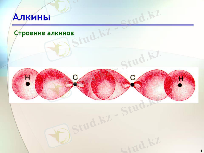 Алкиндердің құрылысы: Ацетилен молекуласындағы әр көміртек атомы бір сутек атомымен байланысады және өзара үш еселі байланыс арқылы жалғасады.