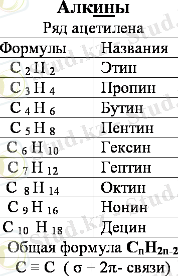 Құрамында үш байланысы бар ең қарапайым көмірсутек - этин (ацетилен) С 2 Н 2 . Бірінші мүшесі ацетиленнен С 2 Н 2 басталатындықтан, алкиндер ацетилен көмірсутектері деп те аталады. Алкиндердің жалпы формуласы С n Н 2n-2 бойынша ацетиленнен кейінгі көмірсутектердің молекулалық формулаларын өздерің жазуларыңа болады.