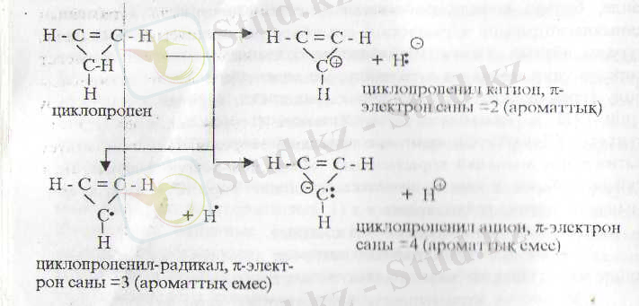 Циклопропен молекуласы Хюккель ережссінің үш шартының екеуіне сәйкес келеді: 1) тұйық тізбек, қанықпаған, 2)