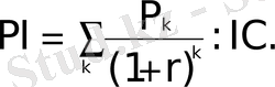 мұнда P k - инвестициялық жобаның жылында алып келетін ақшалай кірістері; IC - инвестициялардық бастапқы сомасы; r - дисконттау коэффициенті.