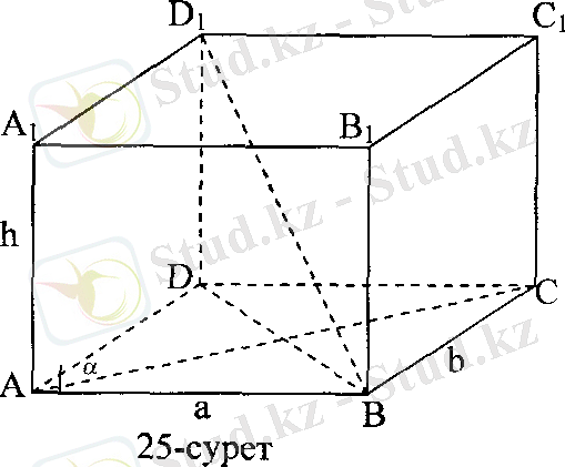 Шығарылуы: Параллелепипедтің табанының үлкен қабырғасын АВ=а арқылы, кішісін ВС=b арқылы белгілейік (25-сурет) . Есеп шарты бойынша a+b=9, DD 1 =h. Параллелепипедтің а, b қабырғаларын және сүйір бұрышын табу үшін, табанының диагоналын есептеп шығарамыз. Параллелепипедтің кіші диагоналы (BD 1 = √33) табанының жазықтығына BD диагоналы болып проекцияланатыны есептің шешуінде дәлелденген. Сондықтан