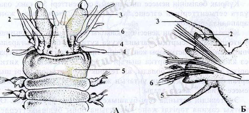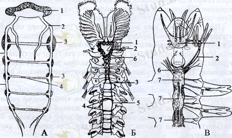 1-cypem. Nereis pelagica: A - бас бөлімінің 1 - простомиум, 2 - антенна (мұртша), 3 - пальпа, 4 - көздер1, 5 - перистомиум, 6 - цирра, 7 - параподия (тұлға сегментінде) ; Б - параподия; 1, 2 - нотоподия, 3 - арқа циррасы, 4 - нейроподия, 5 - құрсақ циррасы, 6 - кылтандар, 7 - сүйеніш қылтан (ацикула)