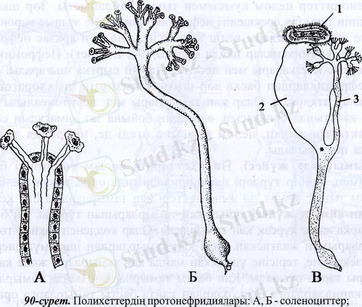 детриттермен /өсімдіктер, жануарлар қалдықтарымен/ қоректенеді. Зәр шығару жүйесі метанефридиялы. Дeнeciнiң әpбip сегментінде оң және сол жақтарында зәр шығару түтіктер1 орналасқан, олардың алдыңғы ұшы воронка түрінде кеңейіп целом қуысына ашылады. Бұл нефростом (грек тіліндеде "нефрос" - бүйрек, "стома" - ауыз), оның қабырғасы кірпікшелі клеткалардан құралган. Нефростома жіңішке түтікке жалғасады, ол диссепиментті тесіп өтіп, келесі сегменттің бүйір жағынан сыртқа қарай зәр шығару тесігімен - не- фропорамен аяқталады. Сонымен, метанефридияның 6ip ұшы целом қуысымен жалғасады да, екінши ұшы сыртқа ашылады, осындай жүйені сегменттелген жүйе деп те атайды. Полихеттердің төменгі сатыдағы түрлерінде зәр шығару жүйені протонефридиялы құрылысты. Heгізri түтіктің алдьңғы ұшында соленоциттер деп аталатын кірпікшел1 клеткалар жинағы болады. Соленоциттер - ішінде ұзын кірпікшелі жіпшесі бар, iiui қуыс, ұзын түтікке айналған дөнгелек денелі клеткалар (2-сурет) . Сонымен, полихеттердің протонефридия жүйесі жалпақ құрттардың протонефридиясына ұқсас, тек ерекшелігі - соленоциттер целом қуысымен тығыз байланысты. Зәр шығару жүйесінің тағы бip ерекшелігі нефридия түтіктеріне жыныс воронкасы немесе жыныс жолдары келіп қосылады, сонымен аралас нефридия немесе нефромиксиялар пайда болады (2, В-сурет) . Нефромиксиялар жыныс клеткалары мен несеп заттарын сыртқа шығарады.