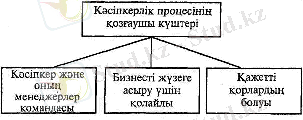 Кәсіпкерлік процесін қозғалысқа келтіретін іргелі күштерге бірінші кезекте, фирманы құрушы және негізін салушы болып табылатын кәсіпкердің өзі, бизнесті (Opportunity) жүзеге асыруға қолайлы мүмкіндік пен қажетті қор жатады (сурет. 1) .