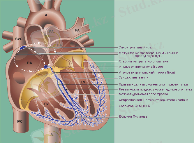 СТ өндірілген электр импульсі (әрекет потенциалы) алдымен жүрек құлақшасына 1 м/с жылдамдықпен жетеді, 40 миллисекундтан соң құлақшаның барлық аймағы қозған күйге, яғни деполяризация күйіне көшеді. Жүрек құлақшасында әр түрлі жолдармен тарағын электр импульстары, жүректің фиброзды ұлпасында орналасқан, электр импульстарын өткізбейтін (қозбайтын), қарыншаны жүрекшеден бөліп тұратын атриовентрикулярлы түйінге бір мезгілде жетеді. Тек осы түйін ғана қозуды, яғни электр импульстарын қарыншадан жүрекшеге жеткізетін бірден бір жол болып саналады. Бұл түйіннің электрлік кедергісі жоғары, сондықтан онда электр импульстарының таралуы қарыншаға қарағанда 0, 02-0, 05 м/с баяу жылдамдықпен тарайды. Аталған құбылыс атриовентрикулярлы тежеу деп аталады. Бұл тежеу диастола кезінде қарыншада жиналған барлық қан көлемін жүрекшенің жиырылуына дейін жүрекшеге жиналуына жететіндей уақыт береді. Атриовентрикулярлы түйіннен тараған электр импульсі жүректің өткізгіш келесі буыны- Гиса шоғына (түйініне) жетеді. Бұл аймақтағы талшықтар жуан болғандықтан оларда электр импульстары 2-3 м/с жылдамдықпен тарайды. Гиса шоғынан Пуркинье талшықтары тарайды, олардың диаметрлері миокард талшығына қарағанда үлкен, сондықтан бұл талшықтрда электр импульстарының таралу жылдамдағы 4-5 м/с жетеді. Ары қарай электр импульстарның таралуы баяулайды, бұл жүрекшенің барлық бұлшық еттерінң синхронды түрде жиырылуына мүмкінді береді. Осылайша электр импулісі жүрекшенің қарынша аймағанда жиырылмаған бөлігіне жетеді(6 сурет) .