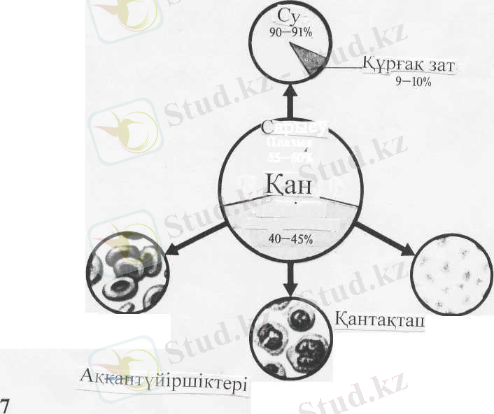Қанның құрамы. Қан сарысу-дан (плазмадан, сары реңді жартылай тұнық сұйықтық) жєне пішінді элементтерден: қанның қызылтүйір-шігі немесе эритроциттер, қанның ақтүйіршіктері немесе лейкоциттер жєне қантақташалары немесе тромбоциттерден құралған (27-сурет) .