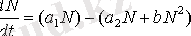 (3) Теңдеу логикасы мынадай: a 1 туу тұрақты болады, осылайша B = a 1 N туу саны популяцияның санына пропорционалды, табиғи өлім де a 2 тұрақты болып есептеледі, ал D = a 1 N+bN 2 толық өлім санын сипаттауға арналған bN 2 квадраттық қосымшасы популяцияның шексіз өсуіне мүмкіндік бермейтін ресурстардың шектеулілігінен туындайды. b коэффициентін түрішілік бәсекелестік коэффициенті деп атайды.
