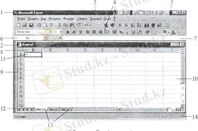 1- жүйелік мәзір; 2- жұмыс кітабының атауы енгізілетін жол; 3-негізгі мәзір; 4- асмпаптар және форматтау панельдері; 5-программа терезесін басқару түймелері; 6- ағымдық нөмірі енгізілетін өріс; 7- формула жолы; 8- баған тақырыптары; 9- жол нөмірі; 10- жұмыс парағы; 11- ағымдық ұяшық; 12- жарлықтарды алмастыру түймелері; 13- жұмыс парақтарының жарлықтары; 14- қалып-күй жолы.