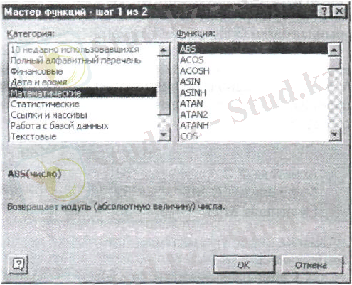 Формулаға функцияны автоматты түрде енгізу де мүмкін. Ол үшін алдымен мәзір арқылы Кірістіру →Функция командасын беру не аспаптар панелінің ƒ х түймесін шерту керек. “Функция шебері”сұқбаттық терезесі ашылады. Әрбір функция категориясы үшін оның құрамы терезенің оң жағында жазылып қойылады. Категория мен оның құрамындағы қажетті функцияны таңдап, ОК түймесін шерту керек. Формулалар панелі көрінеді. Панельге функция аргументін енгізіп, ОК түймесін шерту жеткілікті.