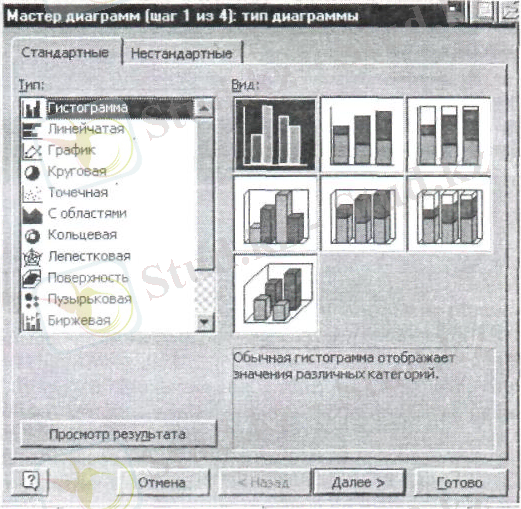 2. Аспаптар панелінің “ диаграмма шебері” түймесін шерту не Кірістіру - Диаграмма командасын беру. Бірінші қадам сұқбаттық терезесі көрінеді.
