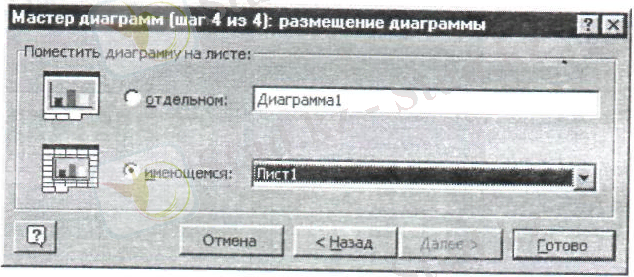 6 . Төртінші сұқбаттық терезеде диаграмманы дайындалған бетке кірістіру ауыстырып қосқышы орнатулы тұрады. Онымен келіспеген жағдайда Бөлек бетке өрісіне диаграмма енгізілетін парақ атауын енгізу (4-сурет) .