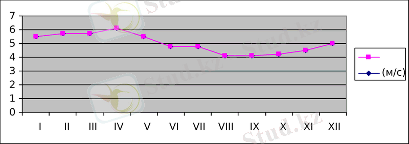 Бұл кесте және суреттен (сурет-2) жел жылдамдығы сәуір айында жоғарғы көрсет-кішті көрсетсе, тамыз, қыркүйек айларында бірқалыпта, ал қыста қараша, желтоқсан айларында жоғарылайтынын байқаймыз.