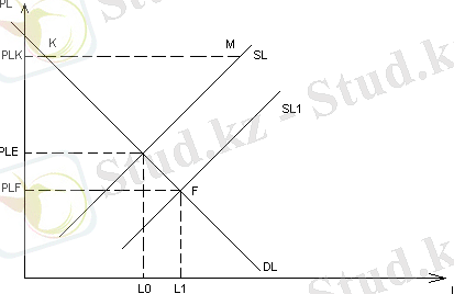 Егер еңбекті ұсыну өсетін болса (SL қисығының SL1-ға ығысуы), онда бұл еңбекақының PLF-ке дейін төмендеуіне әкеледі және де еңбек нарығындағы тепе-теңдік F нүктесінде орнайды. Сонымен, неоклассикалық модельде нарықтық экономика барлық еңбек ресурстарын пайдалана алады, тек еңбекақының иілгіш болу шартында ғана. Берілген жағдайда толық жұмыспен қамтылу өз еңбегінің белгілі бір мөлшерін сатқысы келген кез-келген қалаушы өз тілегін берлген сәтте қалыптасқан еңбекақының ставкасы бойынша жүзеге асыра алатындығын білдіреді. Егер еңбекақы P LK Нарықтық тепе-теңдік деңгейінен жоғары болса, (мемлекеттің қатынасуы немесе профсоюздардың талабы бойынша) онда бұл жқұмысқа деген сұраныстың жұмысты ұсынуынан аз болуына әкеледі және жұмысшылардың белгілі бір массасы жұмыссыз қалады. Жұмыссыздардың саны KM кескіні көрсетеді. Осыдан, неоклассикалық модельде жұмыссыздық нақты, бірақ ол нарық заңдарынан емес, оларды бұзу нәтижесінде пайда болуды, не мемлекеттің, не профсоюздардың, яғни нарықтық емес күштердің еңбекақысы тепе-теңік деңгейіне дейін түсіртпейді, осыдан кәсіпкерлер барлық жұмыс істегісі келетіндерге талап етілген төлемақы ставкасы бойынша жұмысты ұсына алмайды. Сондықтан, неоклассиктердің пікірінше, нарықтық экономикада тек өз ерікті жұмыссздық бола алады, яғни жоғары еңбекақы талабынан туындайтын. Жұмыссыздар өздері жұмыссыздықты таңдайды, өйткені олар өз еңбегі үшін төмен төлемақыға жұмыс істеуге келіспейді. Мемлекеттің ролі жайлы да осыны айтуға болады: егер олеңбекақының деңгейін қадағаласа, онда ол бәсекелестік нарықтық механизмді бұзады. Осыдан необиральді бағыттағы экономистердің талабы туындайды - жұмыссыздықты жою үшін еңбек нарығында бәсекелестікке игіліктік еңбекақыға ұмтылу керек. Осымен бірге неоклассикалық модельде жұмыссыздық игіліктік еңбекақы сақталған кезде де болады, өйткені жұмысшы күштің белгілі бір бөлігі жоғарырақ еңбекақыға ұмтылып, өз еркімен жұмыссыз болып қалады. Бұл жағдайды төмендегі сурет көрсетеді: