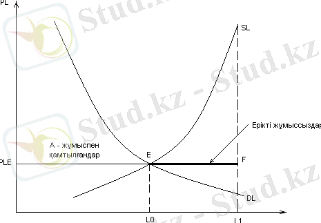 Графикте еңбек нарығындағы тепе-теңдік Е нүктесінде орын алды. Бірақ қалыптасқан нарықтық еңбекақы ставкасында P LE фирмалардың жұмысшы күшке қажеттілігі (сұраныс қисығының учаскесі D L , Е нүктесінен төмен ) толық қанағаттандырылмайды, EF шамасын құрайды. Ал бұл қажеттіліктің қанағаттандырылуы жолы жоқ, өйткені жұмыссыз жұмысшылар тек жоғарырақ ставка үшін ғана еңбектенуге келіседі (еңбекті ұсыну қисығының учаскесі S L E жоғары) . Осыдан шығатыны, нарық ұсына алатын еңбектің максималды мөлшері L 1 шамасын құрайды (АF кескіні), ал фирмалардың еңбекке төлеуге қабілетті сұранысы - L 0 (АЕ кескіні) . Осы екуінің арасындағы айырымын фирмалар ұсынатын еңбекақы үшін жұмыс істегісі келмейтін жұмысшылардың санын ЕF кескіні көрсетеді.