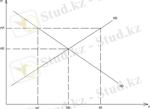 Классикалық мектеп позициясынан осы жерде еңбек бағасы W 0 - W 1 мөлшерінен асып тұр. Егер де оны W 1 -ге дейін төмендетсек, жұмыссыздық еңбек нарығындағы сұраныс пен ұсыныстың стихиялы арақатынастың кезінде жойылмайтын N 1 -N 0 өлшемінде сақталады.