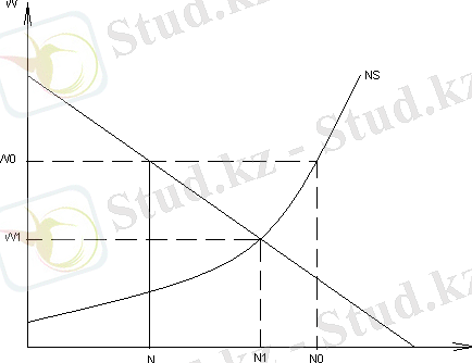 Еңбек нарығында сұранатын еңбек мөлшері ұсынылатын еңбек мөлшеріне тең болғанда орнайды: N D =N S