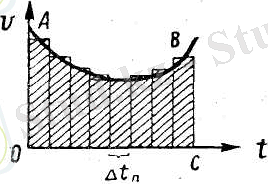 яғни ОАВС фигурасын (5-сурет) бөлгенде шыққан барлық тік төртбұрыштардың аудандарының қосындысына тең. Ең ақырында, шексіз аз ∆ t n уақыт аралықтарында тік төртбұрыштар да шексіз жіңішке болады да, олардың аудандарынын қосындысы ОАВС фигурасының ауданымен беттеседі. Сонымен, графикпен көрсеткенде барлық s жолы жылдамдықтың уақытқа тәуелділігін көрсететін АВ қисығы мен сол жолды жүруге кеткен t уақыттық басы мен ақырына сәйкес келетін ординаталардың арасындағы ауданмен кескінделеді.