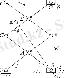 , а - суретте 7 платформасы бар жүк көтеруші механизмнің кинематикалық сұлбасы және 1 кіріс буыны көрсетілген. “Нюрнберг қайшысы” атты дәстүрлі механизмді төменгі жетекті сұлбасы атау қабылданған, сызықтық қозғалыстың С сырғаның жалпыланған координатасы q=s; s=AС бар. Механизмнің кинематикалық сұлбасы буындар ұзындығымен AF=FJ=CD=2c және платформаның көтерлу биіктігімен h=AJ анықталады .