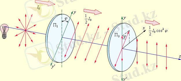 Поляризатордан соң жарық шығады, интенсивтілігі I 0. Малюс заңына байланысты анализатордан соң жарық алынады, оның интенсивтілігі мынадай теңдеумен анықталады: