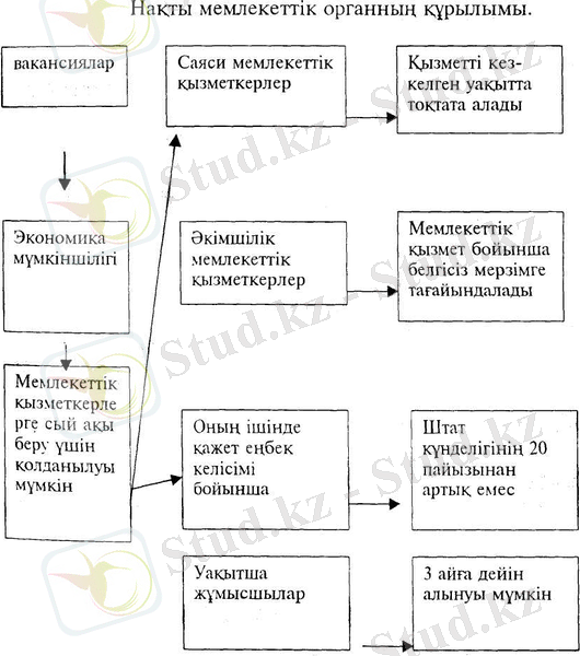 Мемлекеттік қызметкерлердің 96-97 пайызын құрайтын әкімшілік қызметкерлер саяси басшылықтың ауысуы жағдайында жұмыстан шығарып жіберуден сақтандырылып мемлекеттік қызметінде жетістік жасауына стимул алды. Осылайша мемлекеттік оргондардың кадрлар құрылымына саяси мемлекеттік қызметкерлер, әкімшілік мемлекеттік қызметкерлер, мешекеттік қызметкер болып есептелмейтін бірақ уақытша жұмысқа алынған қызметкерлер кіреді (4-ші сурет) .