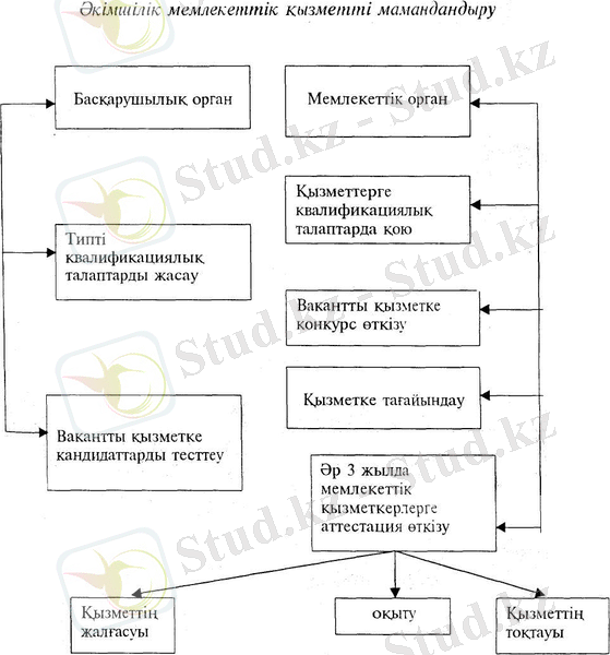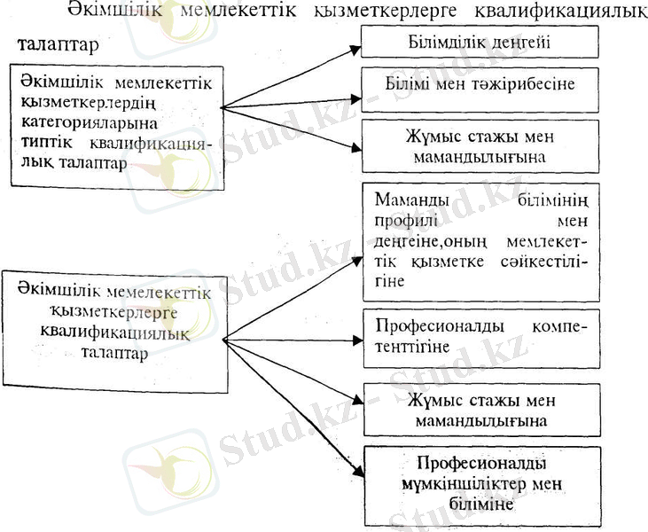 Зандарда және заң актілерінде мемлекеттік қызметкерлердің мамандығын жоғарлатуға бағытталған шаралар айқындалған. Ол мемлекеттік қызметке компетентті емес адамдардың келуіне анық кедергі болатын мемлекеттік қызметке ұсынылған категорияларға квалификациялық талаптарды қою (7-ші сурет) .
