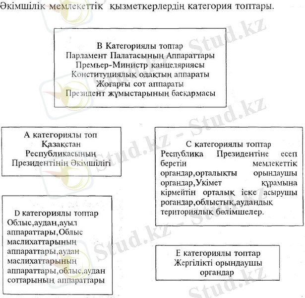Қызметтерді мемлекеттік қызметкерлердің әкімшілік категорияларына бөлу қызметкерлерді сәйкес басқару құрылымымен квалификациялауға мүмкіндік берді. (10-сурет) Тізім бойынша әкімшілік мемлекеттік қызметкерлер А, В, С, Д, Е, категория топтарына бөлді. (А-президент әкімшілігі. В-республикалық деңгейдегі басқарма орган аппараты. С-республикалық деңгейдегі мемлекеттік аппарат органдары, Д - жергілікті деңгейдегі басқарма аппаратының оргондары, Е-жергілікті орындаушы аппарат органдары) .