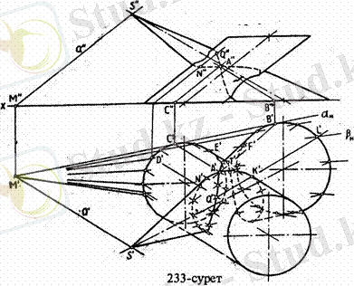 Көлбеу цилиндр мен конус беттерінің қиылысу сызығын салу (233-сурет) . Қиылысу сызығын салу үшін көмекші қиюшы жазықтықтар енгізуіміз керек. Қиюшы жазықтықтар берілген беттерді жасаушылары бойымен қиып өтетіндей жағдайда таңдап алынады. Конус бетін жасаушылары бйымен қиятын жазықтықтар оның төбесі арқылы өтеді. Ендеше конустың төбесі арқылы өтетін және цилиндрдің жасаушыларына параллель болатын a түзуін жүргізейік. Сонда a түзуі және конустың немесе цилиндрдің кез келген жасаушысы қиюшы жазықтықты анықтайды.