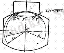 3-мысал. Тор және цилиндр беттері қиылысқан (237-сурет) . Қиылысу сызығын табу керек. Беттердің қиылысу сызығын табу үшін көмекші сфера әдісі қолданылады. Сфера бұл беттерді шеңберлер бойымен қиып өтетіндей етіп алынады.