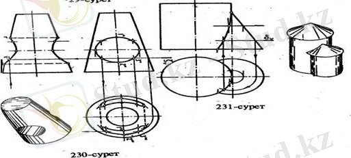2-мысал. Су құбыры шүмегінің тығынды цилиндр тәрізді өткерме тесігі бар қиық конус (230-сурет) . Конус пен цилиндр беттерінің айналу осьтері өзара қиылысқан. Осы беттердің қылысу сызығының проекцияларын салу үшін, бетте қарапайым сызық (шеңбер, түзу) бойымен қиылысатындай көмекші қиюшы жазықтықтарды таңдап алады. Қиюшы профиль жазықтық (