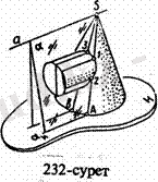 4-мысал. Конус пен цилиндр өзара қиылысқан (232-сурет) . Қиылысу сызығын табу үшін көмекші қиюшы жазықтықтарды беттерді жасаушыларының бйымен өтетіндей жағдайда таңдап аламыз. Конустың төбесі арқылы цилиндрдің жасаушыларына параллель a түзуін жүргізейік. A түзуі арқылы өтетін жазықтықтар цилиндр бетін де конус бетін де жасаушылары бойымен қиып өтеді. Беттердің жазықтықпен (