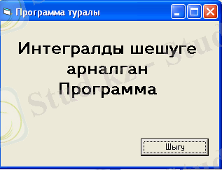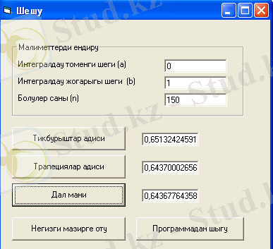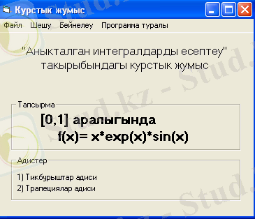 Visual Basic ортасында құрылған бұл курстық жұмыстың екі жуықталған шешімі бар, біреуі тікбұрыштар әдісімен жасалса екіншісі трапециялар әдісі көмегімен. Осы екі шешім Ньютона-Лейбниц әдісімен табылған дәл шешіммен салыстырылады. Екі әдістің қателіктері график түрінде бейнеленеді.