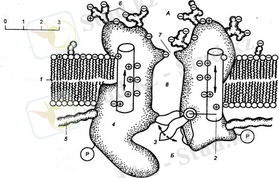 4 - селективті фильтр 5- ақуыз макромолекуласы, 6-көмір сулар, 7- пор,