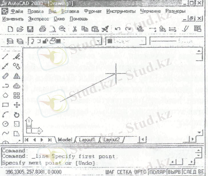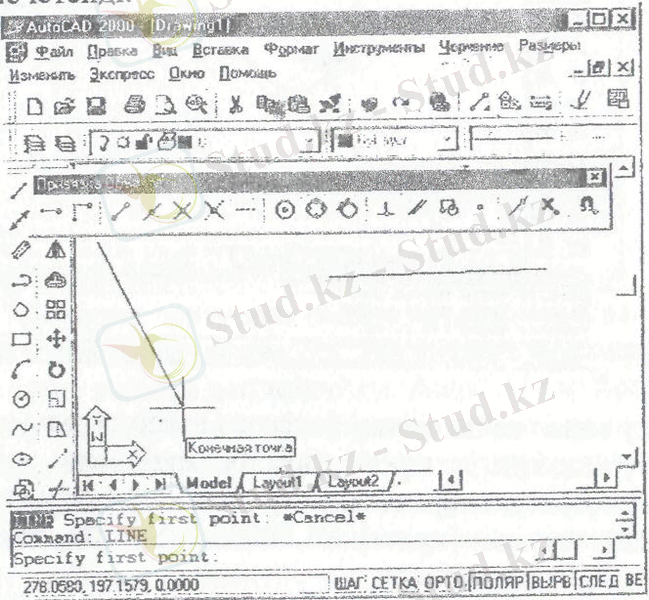 Erep сіз тышқанның көмегімен келесі нүктені экранға нұсқасаңыз, онда экранда бірінші нүктеден екінші нүктеге өткізілген кескін пайда болады. (1-сурет) . Кескін (Line) командасы осымен аяқталады және сауал болады: