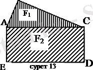 А∩В¹Æ деп санап, А және В жиындарын Эйлер-Венн диаграммалары арқылы кескіндейік (12-сурет) . Осы суреттегі штрихталған бүкіл бөлік А∪В жиынын көрсетеді. Бірігу ұғымы геометрияда үлкен роль атқарады. Екі немесе бірнеше фигуралардың бірігуі деп осы фигуралардың ең болмағанда біреуіне тиісті нүктелер жиынын айтады. F 1 және F 2 фигураларының бірігуін F 1 ∪F 2 түрінде жазады. Мысалы, егер F 1 - ABC үшбұрышы, ал F 2 - ACDE төртбұрышы болса, онда олардың F 1 ∪F 2 бірігуі ABCDE фигурасы болады. (13-сурет) .