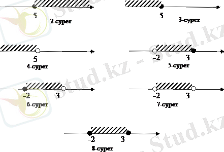 Осыларға ұқсас 3-8 суреттерде х≤5 (3-сурет), х<5 (4-сурет), -2<х≤3 (5-сурет), -2≤х<3 (6-сурет), -2<х<3 (7-сурет), -2≤х≤3 (8-сурет) теңсіздіктерін қанағаттандыратын барлық х сандарының жиындары көрсетілген.