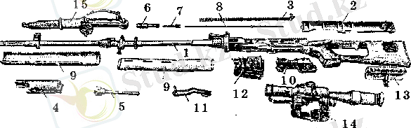 17-сурет. Мергендік винтовкасының механизмдері: 1 - ашық көздеуіш және дүм, ұңғы корапшасы бар ұңғы; 2 - ұңғы корапшаның какпары; 3 - кайтармалы механизм; 4 - бекітпе жақтауы; 5 - бекітпе; 6 - реттегіші бар газ түтігі; 7 - газ поршені; 8 - серіппелі итергіш; 9 - ұңғы жабуы; 10 - соққы-ағыткыш механизм; 11-тежегіш; 12-оқжатар; 13 - дүм жағы; 14 - оптикалық көздеуіш; 15 - сүңгі-пышақ