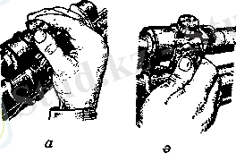 67-сурет. Жатып ату кезінде винтовканы ұстау әдістері: a - ұңры жабуынан ұстау; ә - оқжатардан ұстау