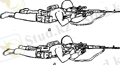 • отырып ату кезінде екі кол шынтақтарын немесе егер мергенге ыңғайлы болатын болса, тізеден түсіре қою керек (68, 6-сурет) .