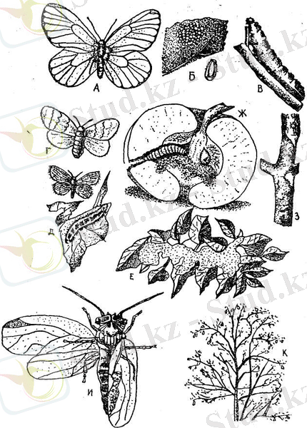 а-долана көбелегі; б-жапырақтағы долана көбелегінің ұрықтары және ұрықтың жеке түрі көрсетілген; в-долана көбелегінің жұлдыз құрты; г-көбелек-жалғыз жібек құрты - аналық түрі; д-көбелек - жалғыз жібек құрты - аталық түрі, жапырақтағы жалғыз жібек құртының бір түрі; е-бұтақтағы алма битінің қанды түрі; ж-алма жемісіне түскен жеміс жегіш жұлдыз кұрты; и-алмұрт бүрге шіркейі; к-бүрге шіркей түскен алмұрт.
